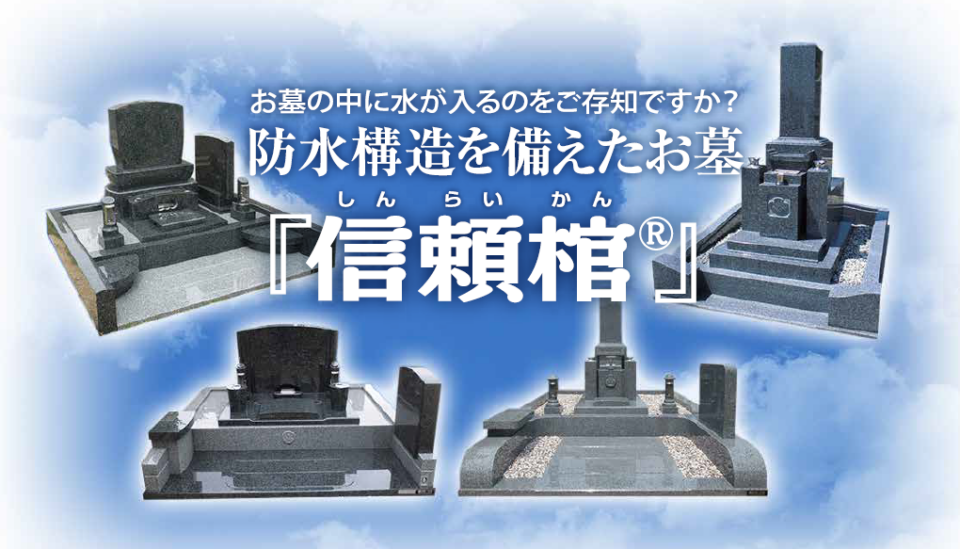 『信頼棺®』は、納骨室に雨水が入り込まない特殊な構造で設計されたお墓です。日本は雨や台風が多く、カロート部分に水が溜まってしまい、骨壺、サラシ袋が汚れてしまうことも少なくありません。さらに、 虫やヘビなどが侵入したり、ハチの巣ができてしまうこともあり、放っておけない状況です。大切なお墓が泥水でいっぱいになるのは耐えられない、自分がお墓を建てるときは中に水が入るのが絶対に嫌だ、そんな問題を解決するために誕生したのが「信頼棺Ⓡ」です。ご先祖様が安心して眠れ、大切なご遺骨を守り続ける、信頼性の高いお墓です。見えない部分にまでこだわり抜いた構造で、大切なお墓を長く守る、それが「信頼棺Ⓡ」です。東北地方では、佐藤新作石材のみが正規加盟店です。安心してお任せください!