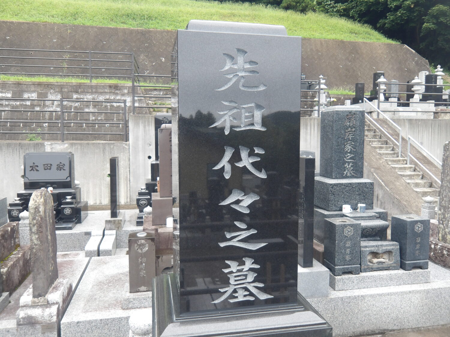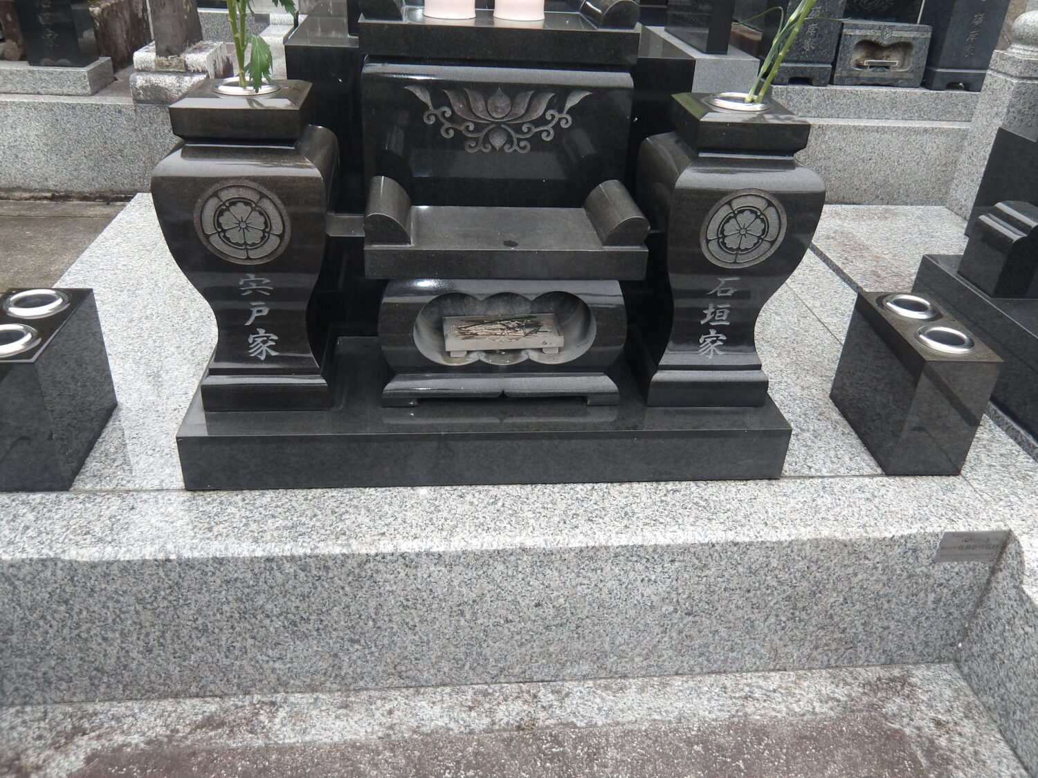 ・花立て石に、「宍戸家」、「石垣家」を彫刻しました。