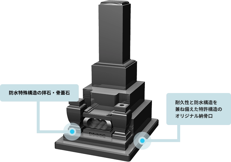 「信頼棺®」は、防水構造のお墓です。 防水仕様の納骨口と特殊構造のカロートにより、水の侵入を防ぎます。